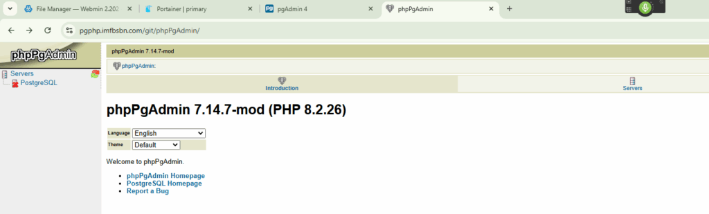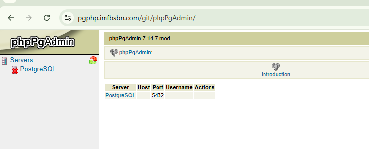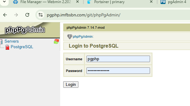 Now we can direct our favorite web browser to: https://pgphp.imfbsbn.com/git/phpPgAdmin/ (remove “git/” from the URL as appropriate.)