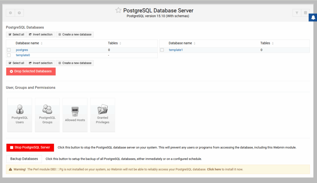 Awesome! Now your Virtualmin server is running PostgreSQL and has all the tools for you to avoid the command line (for the most part.)