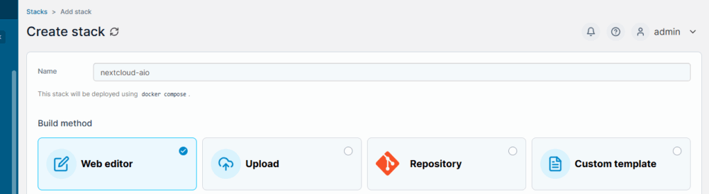 Within Portainer click on your installation, then stacks, then the button to create new stack. Give your stack a name.