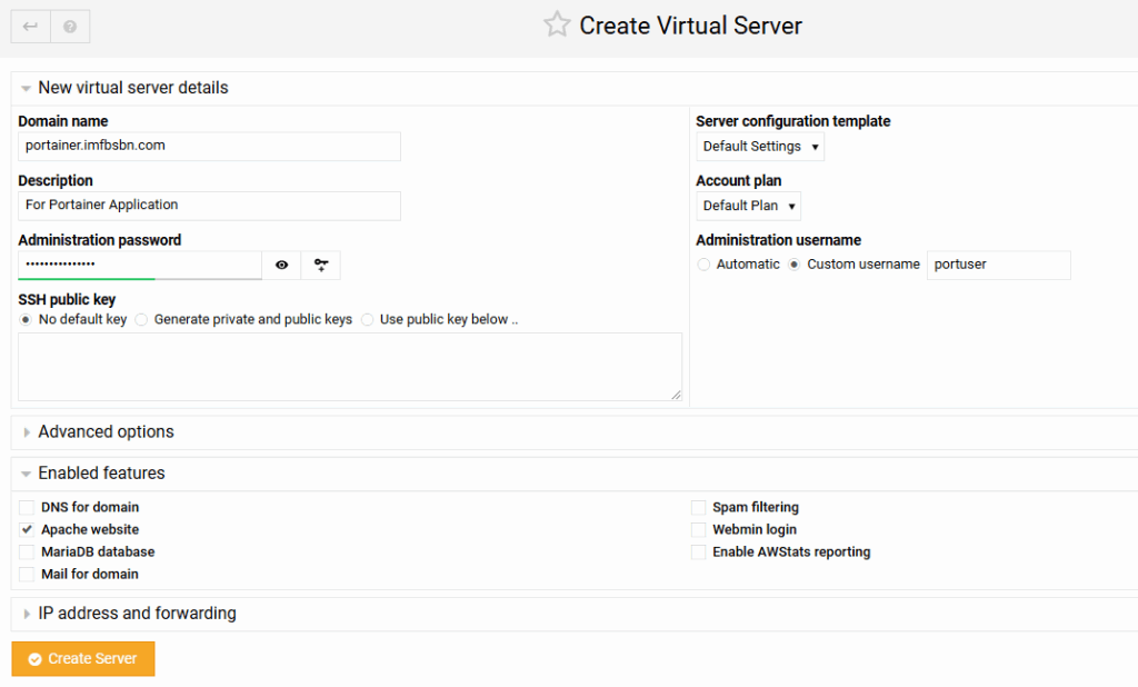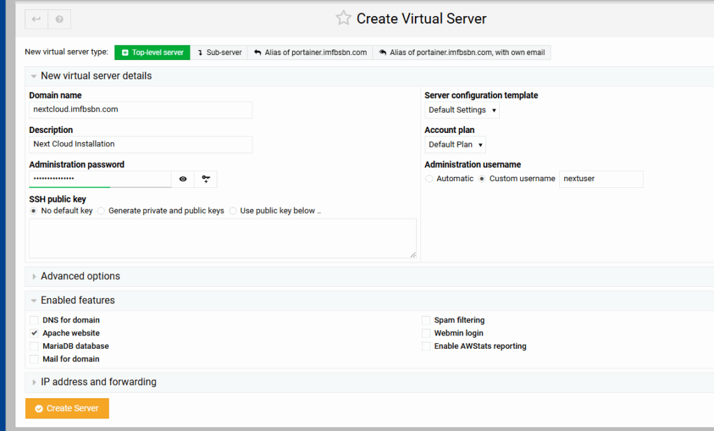 For this domain we will not be needing a MariaDB. So we can uncheck that box as well. Then create the server.
